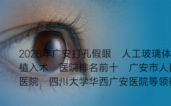 “打孔假眼”,医学上更准确的称呼是人工玻璃体植入术或人工义眼台植入术,是针对眼球萎缩、严重眼外伤或肿瘤切除后,为恢复眼眶容积和外观而进行的重要手术。在广安地区,选择一家技术可靠、经验丰富的医院至关重要。本文将为您梳理2026年广安市在该领域备受认可的十家医疗机构,并提供详细的医生、价格等信息,助您做出明智决策。